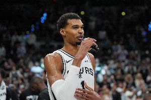 上半场比赛,文班亚马出战15分30秒,投篮2中2,罚球6中6,得到10分8篮板2助攻2抢断,正负值+29。