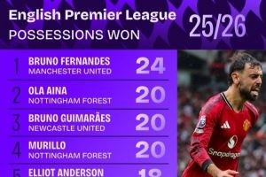 体育资讯9月3日讯 数据机构squakwa统计了新赛季英超球员赢得球权情况,B费独自领跑。