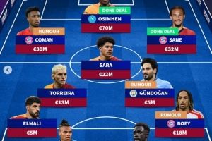 前锋:科曼(拜仁,3000万)、奥斯梅恩(那不勒斯,7000万)、萨内(拜仁,3200万)