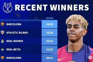 德转列近10年国王杯冠军: